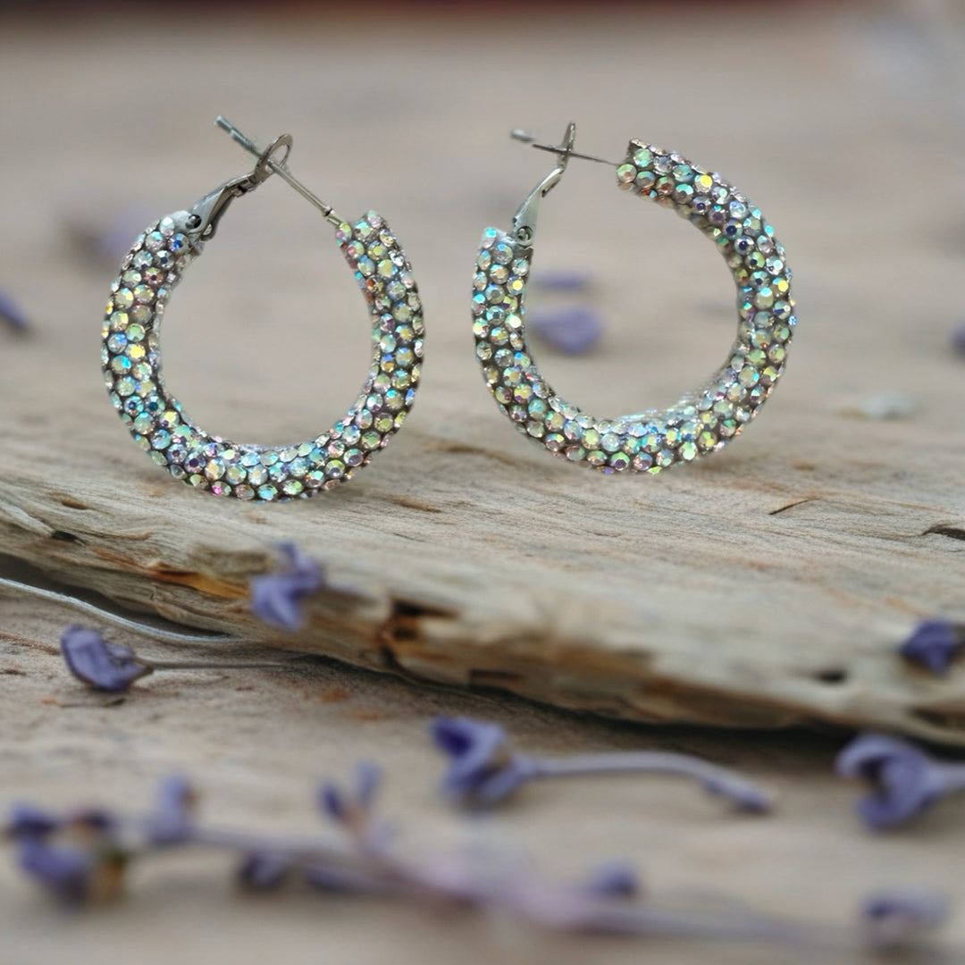 Add a pop of shimmer to your look with these 30mm iridescent sparkly hoop earrings. Handmade with care and hypoallergenic materials, they’re perfect for sensitive ears and ready to brighten any outfit with a playful glow.