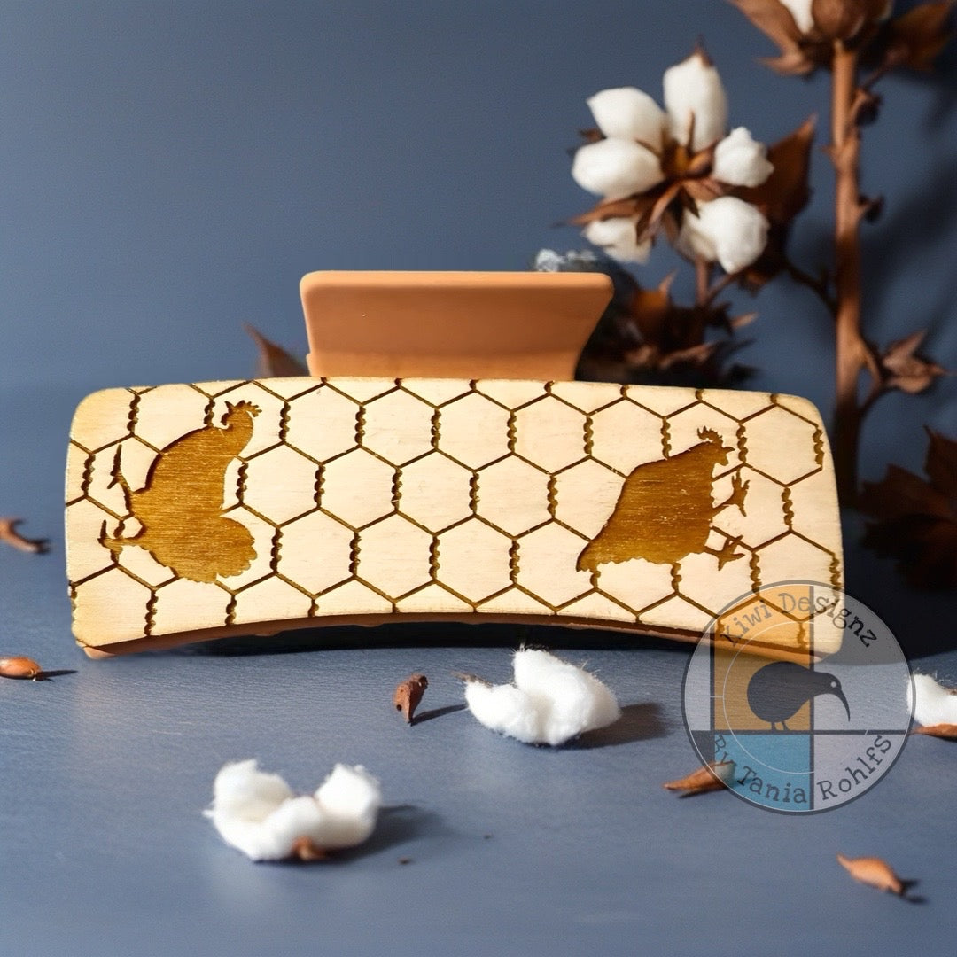 Capture charming farmhouse style with this 4" claw clip featuring hand-painted, laser-engraved chickens behind detailed chicken wire. Its sturdy design ensures a secure hold, while the unique artwork adds a playful touch to your look. Perfect for anyone who loves rustic, handcrafted accessories that stand out with personality.