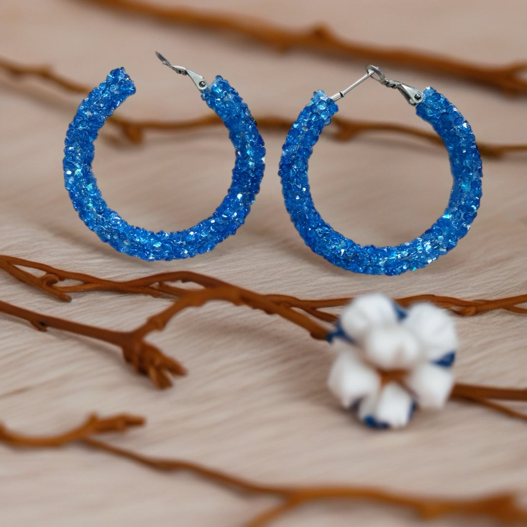 Add a pop of sparkle to your look with these 40mm handmade blue hoop earrings. Lightweight and hypoallergenic, they’re perfect for all-day wear without any irritation. Whether you’re dressing up or keeping it casual, these playful hoops bring a fun, shimmering touch to every outfit.