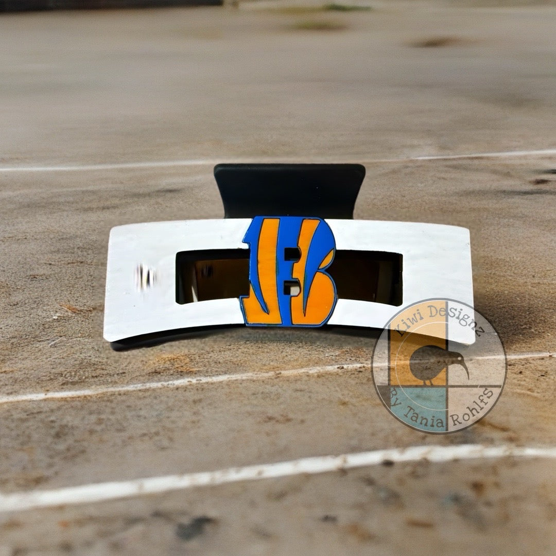 Elevate your hairstyle with the B for Bengals 4" claw clip, expertly hand-painted to showcase vibrant, unique patterns. Crafted from natural wood, this durable accessory offers a comfortable grip while adding a touch of artisanal charm. Perfect for securing any hair type with style and ease, it combines practicality with eye-catching design for everyday elegance.