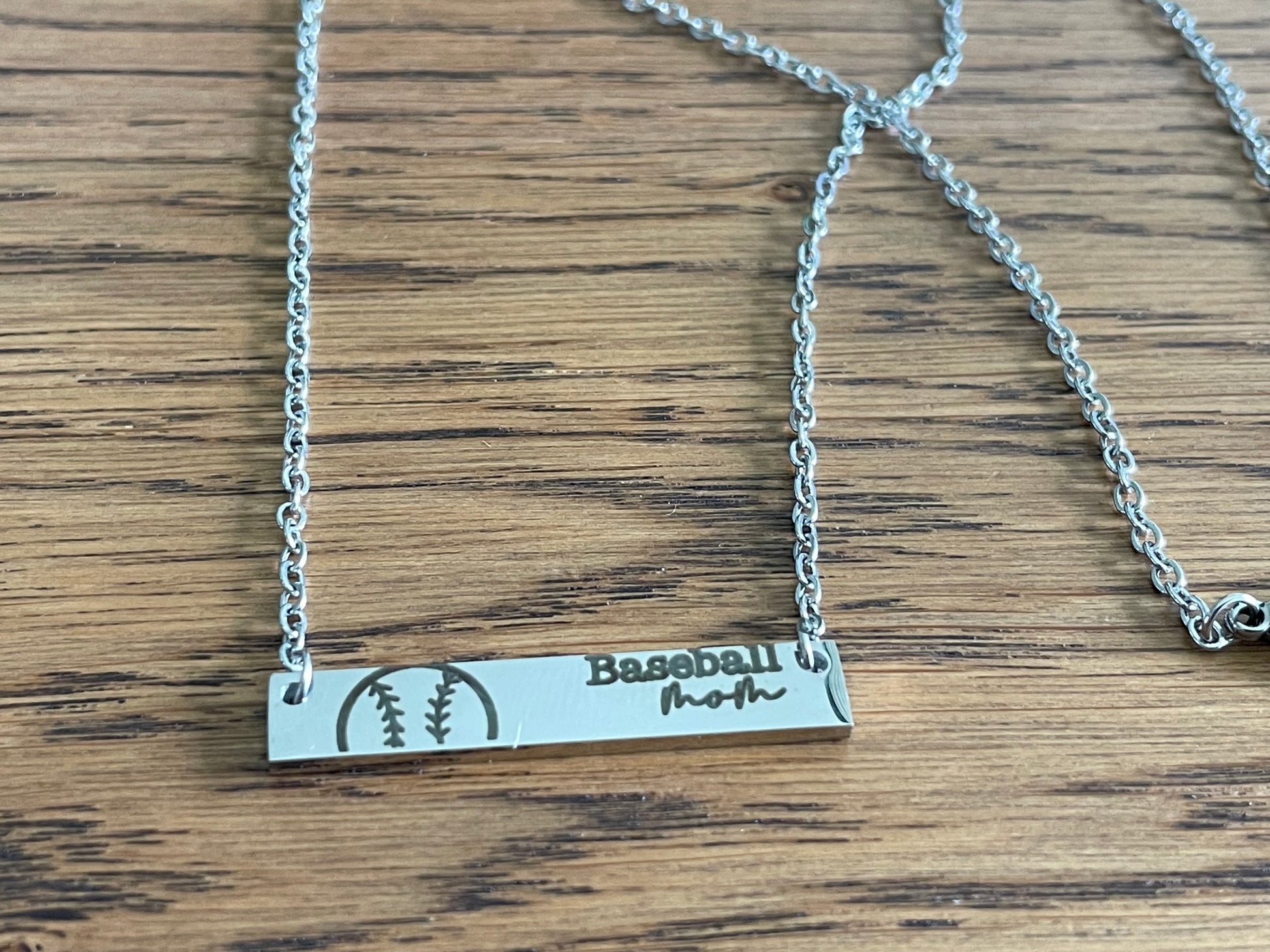 Become the ultimate Baseball Mom and show off your team spirit with this sleek and durable stainless steel PVD coated bar necklace. The laser engraved design is resistant to scratches and wear and tear, perfect for active moms on the go. Hypoallergenic and stylish, this necklace is a must-have for any baseball fan.
