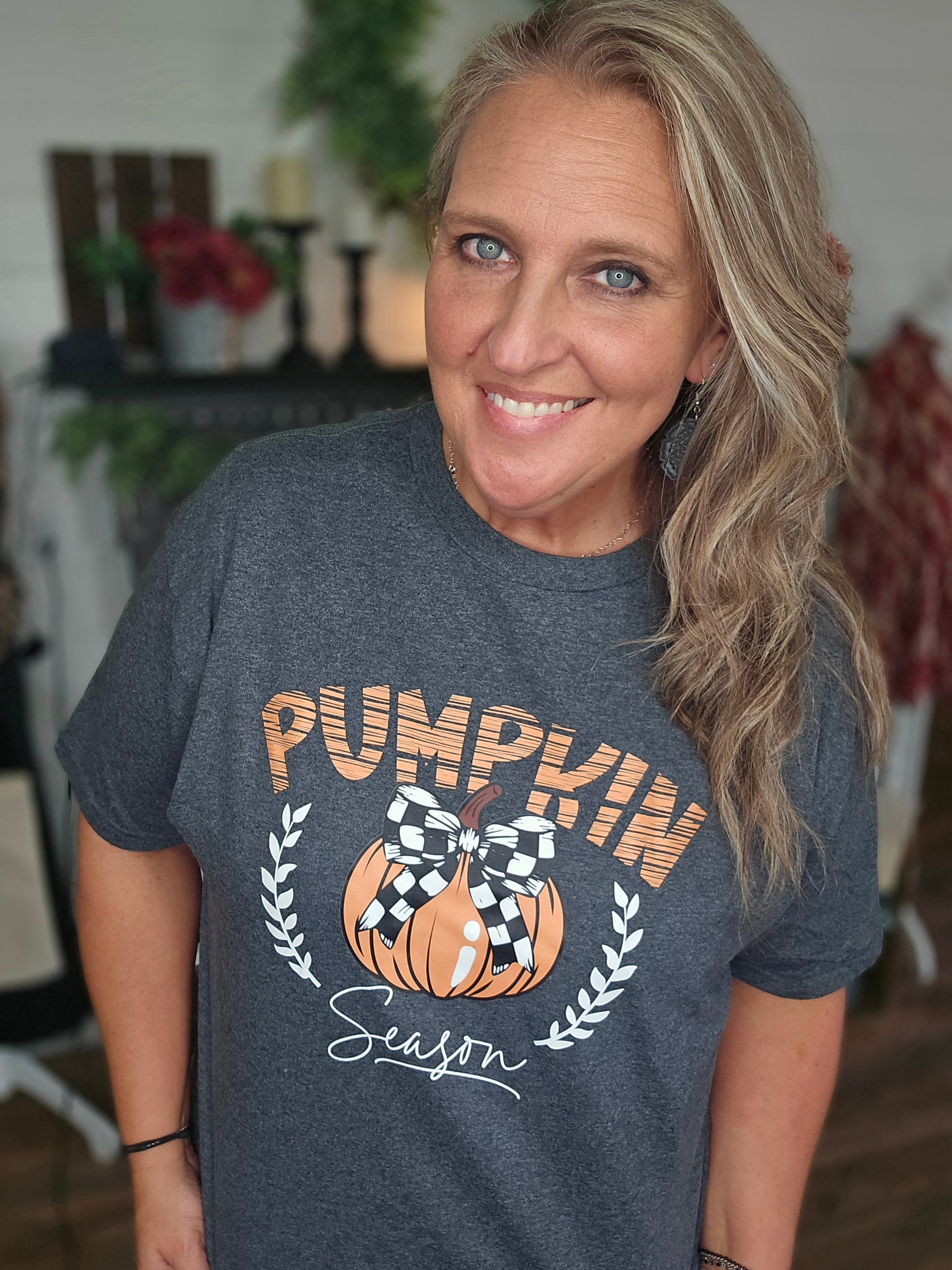 Experience fall fashion with our Checkered Pumpkin Season Tee. Made with a classic black tee and adorned with a festive pumpkin season graphic, this shirt is perfect for any autumn occasion. Show off your love for the season with this stylish and comfortable tee.