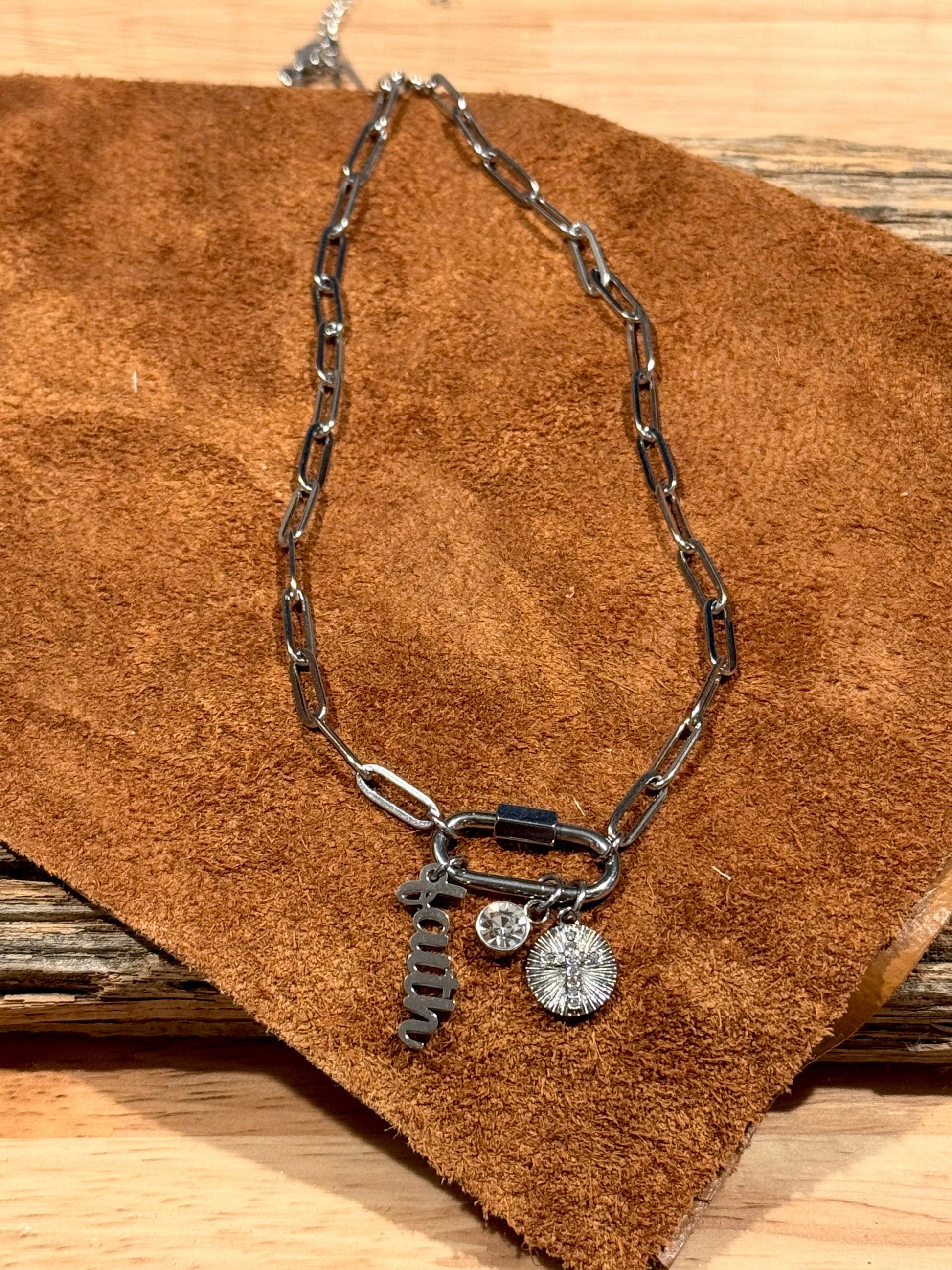 Add a little sparkle and spirit to your look with the Silver Paperclip Faith Charm Necklace! Featuring a charming Faith charm, a classic cross, and a twinkling crystal, all hanging from a trendy silver paperclip chain. The fun carabiner clasp makes it easy to wear and hard to lose—perfect for those who like their faith with a side of flair! CHN109