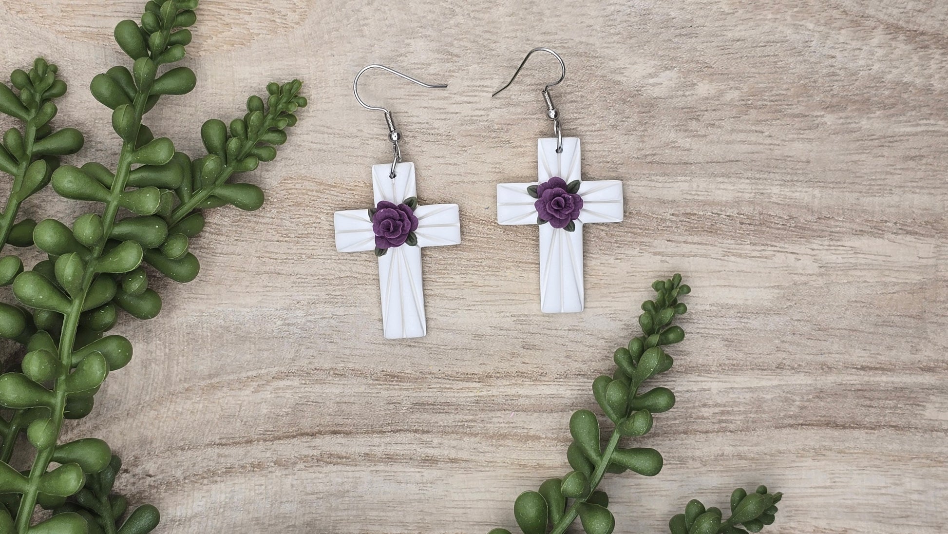 Enhance your style with our Large Dangle earrings. Featuring a beautiful white cross with a delicate flower, these earrings are the perfect addition to any outfit. Perfect for Easter or any time of year, they are sure to make a statement and add a touch of elegance to your look.