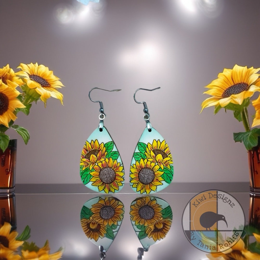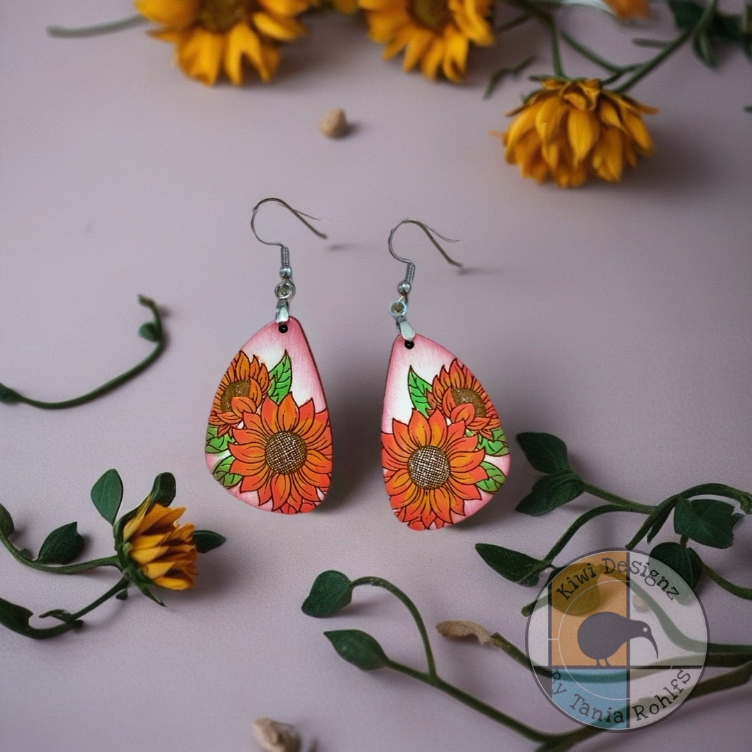 These Double Sunflower drop earrings feature hand-painted, laser-cut wooden designs that are both lightweight and comfortable to wear. Crafted with hypoallergenic earring hooks, they ensure irritation-free wear for sensitive ears. Add a touch of natural elegance to your look with these beautifully detailed, easy-to-wear earrings.