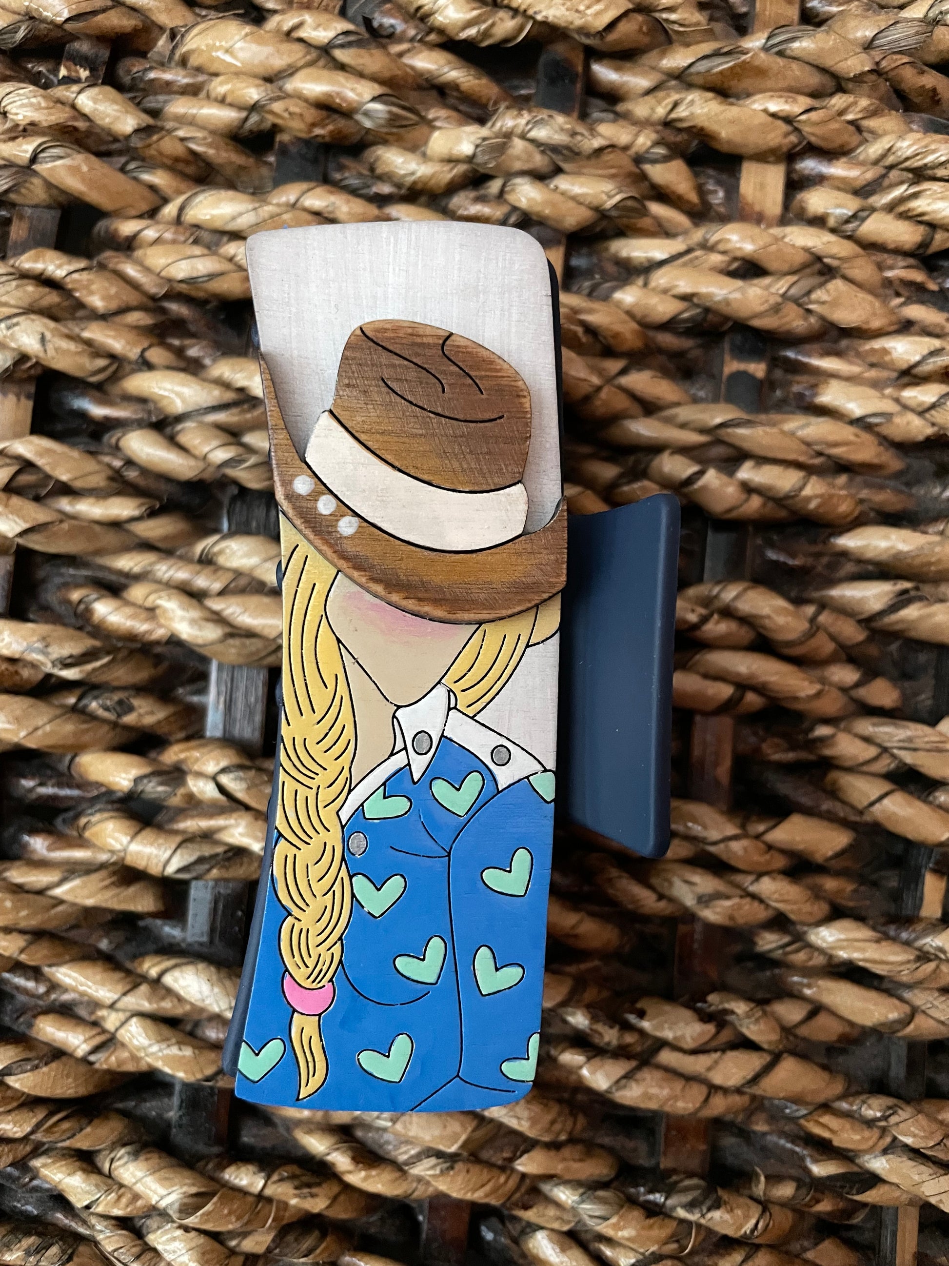 Add some wild west flair to your hair with the Girl with Hat & Braid hair accessory. This unique claw clip is hand painted and features a western girl with a braid and cowboy hat. Measuring at 4 inches, it's perfect for holding hair in place while adding a touch of playful personality. Giddy up!