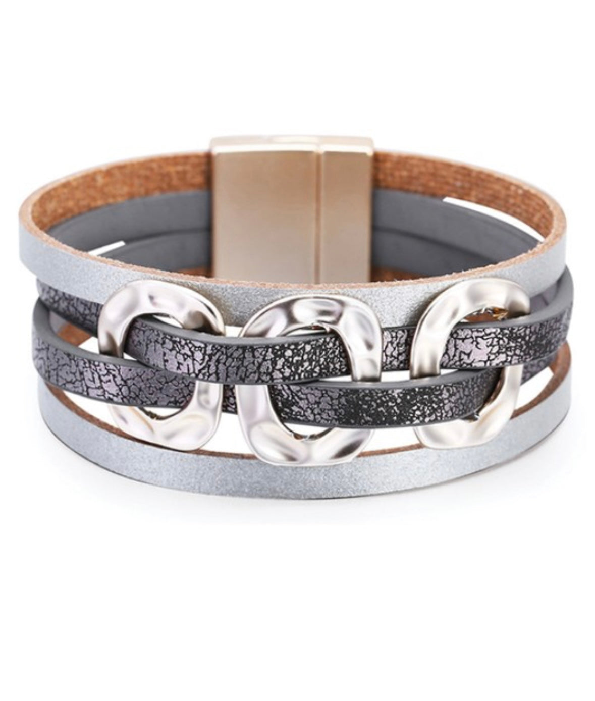 This Grey Multi Strand Bracelet is expertly crafted with a mix of metal and leather materials, creating a stylish and durable accessory. The blend of materials adds a touch of sophistication while ensuring long-lasting wear. Elevate your daily look with this versatile and on-trend piece.