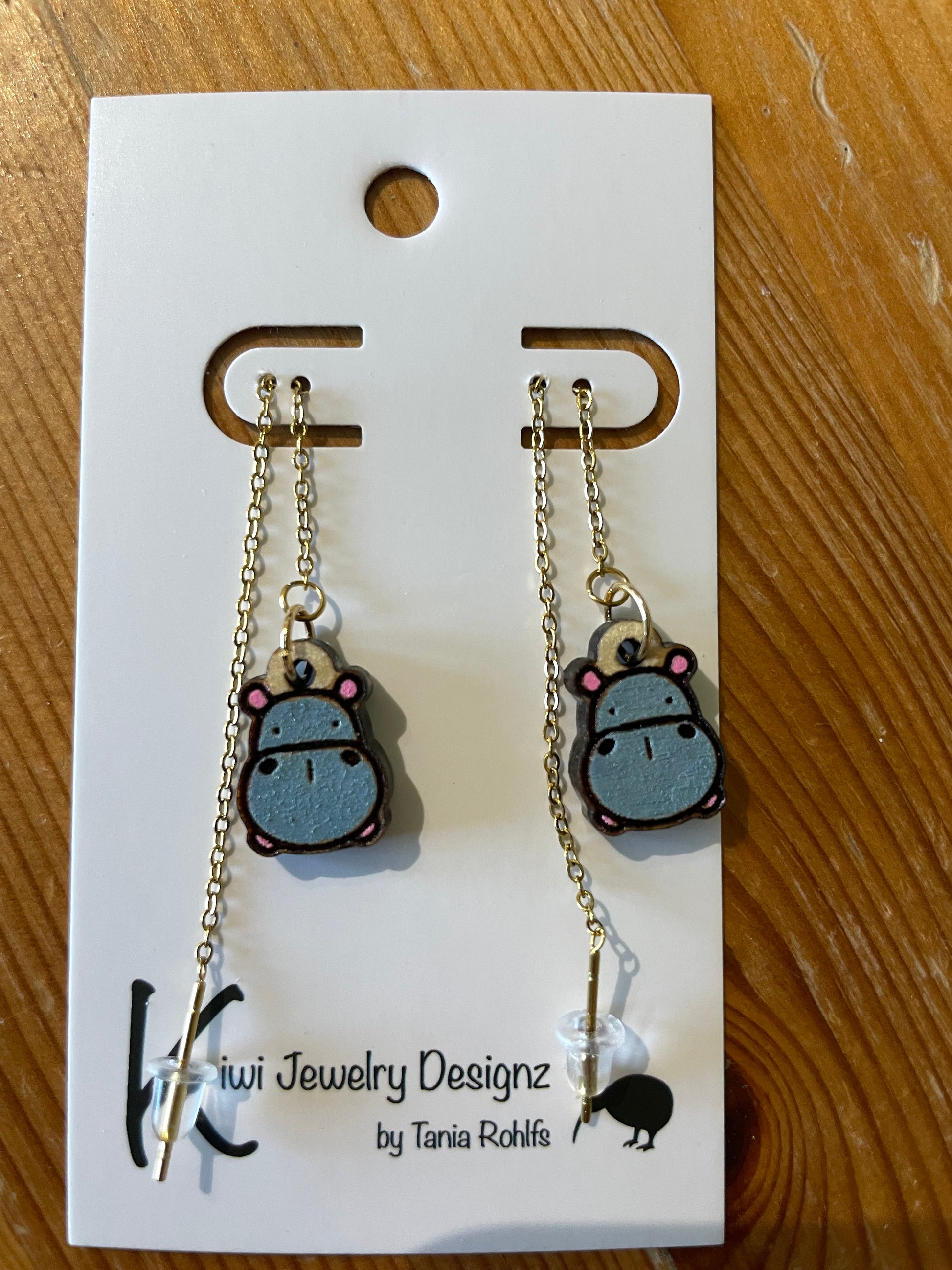 These hand painted hippopotamus threader earrings are hypoallergenic and ideal for youth, with a shorter length for easy wear. Make a fun and unique statement with these eye-catching earrings!