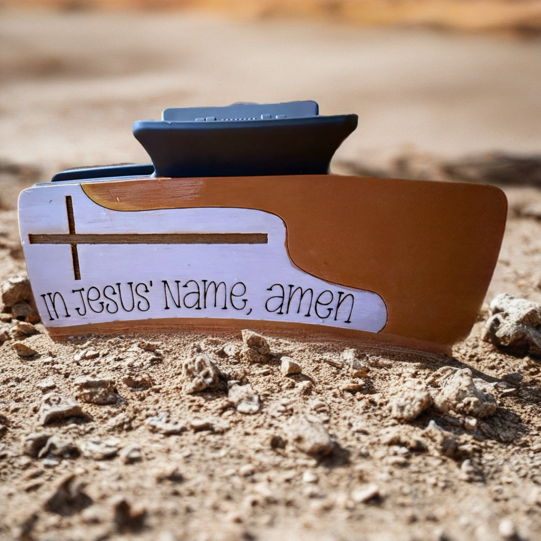 Declare your faith with this stunning hand-painted claw clip featuring the powerful message "In Jesus Name, Amen." Each 4" clip is meticulously laser-cut and individually painted, making it a unique accessory that celebrates your spiritual journey. Perfect for holding your hair in place while keeping your beliefs close, this versatile clip works beautifully on all hair types and textures. A meaningful way to express your devotion through everyday style—wear your faith proudly.