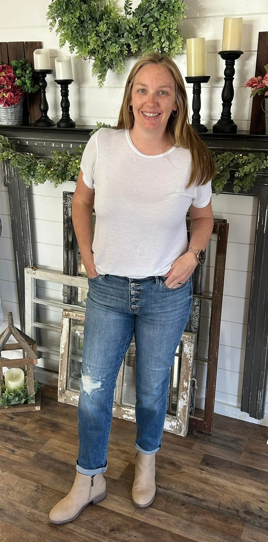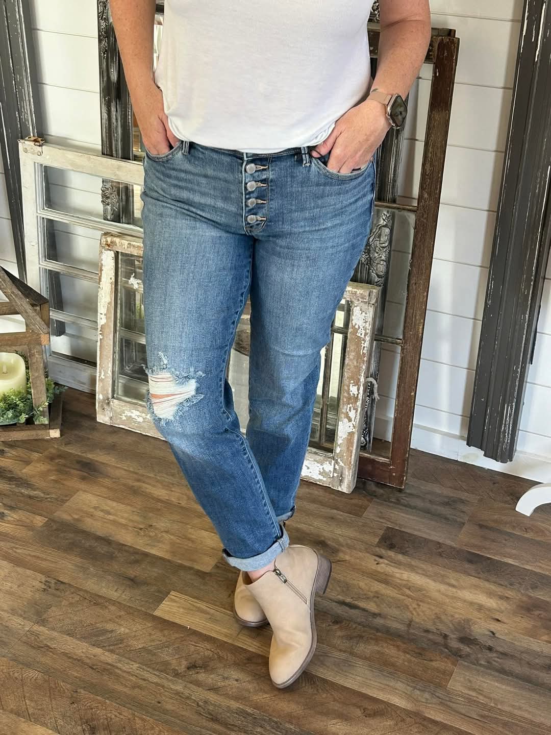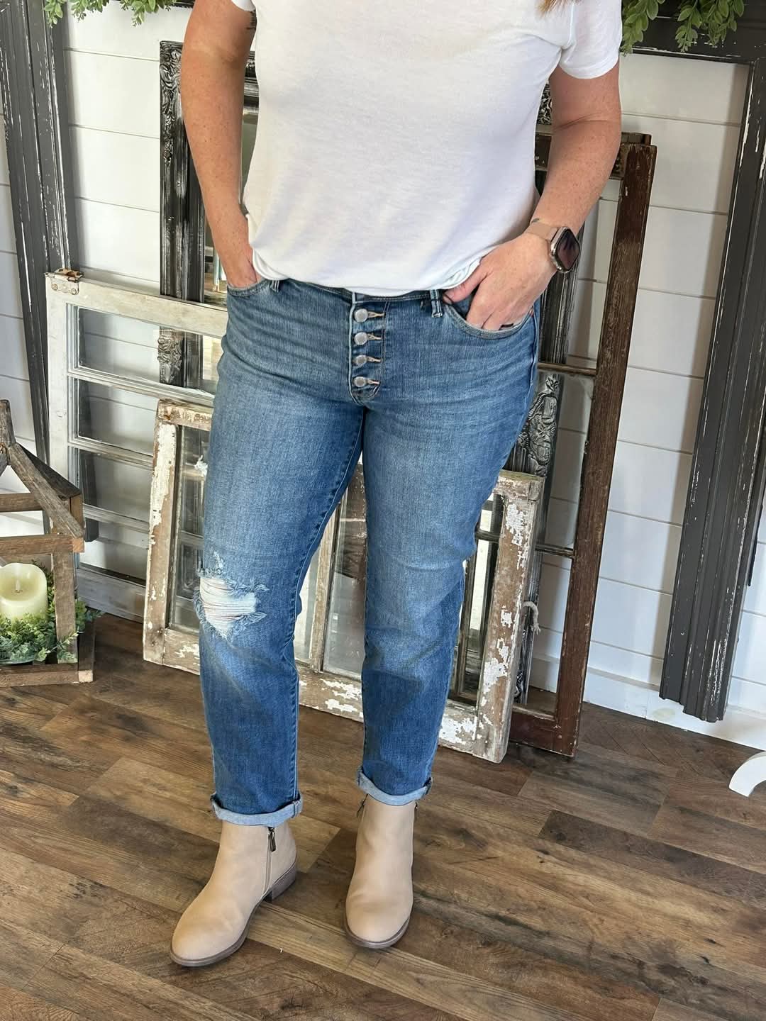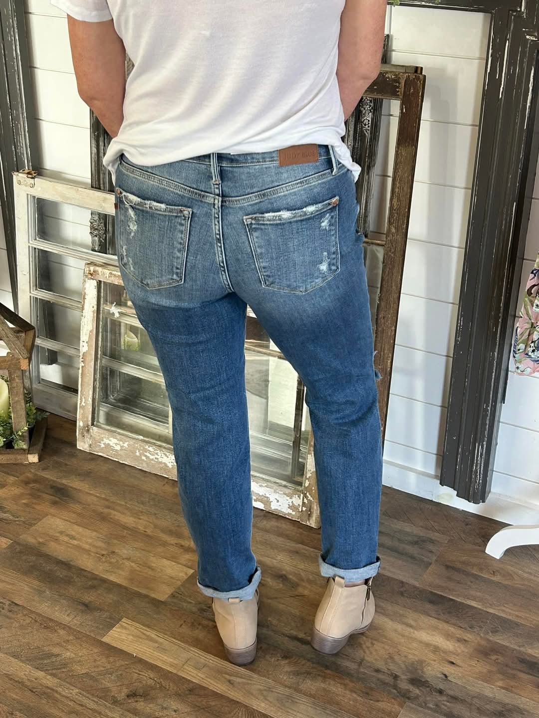 These Judy Blue MR Button Fly Boyfriend jeans feature a destroyed look and cuffed hem for an effortlessly edgy style. Made with high-quality materials, they offer a comfortable fit and are designed to last. Add these versatile jeans to your wardrobe for a trendy, yet timeless addition.
