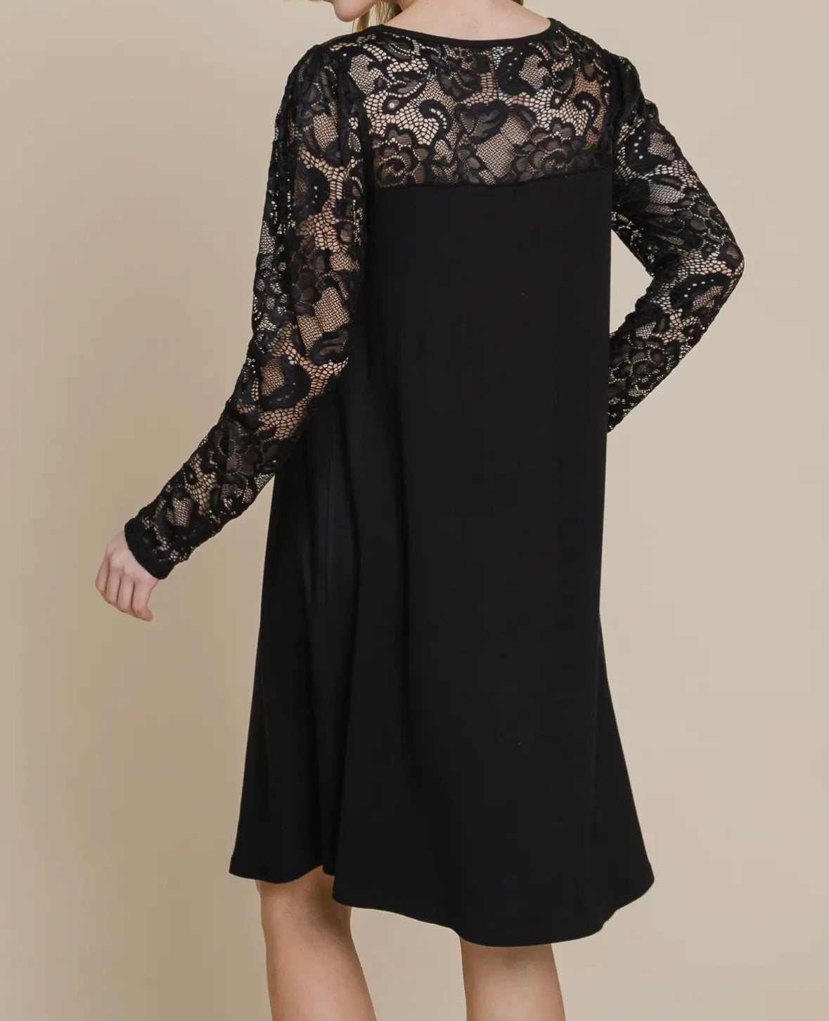 LaceElevate your holiday style with our Little Black Holiday Dress. Delicate lace sleeves and a flattering lace neckline add elegant touches to this classic piece. Make a statement without saying a word in this timeless dress.