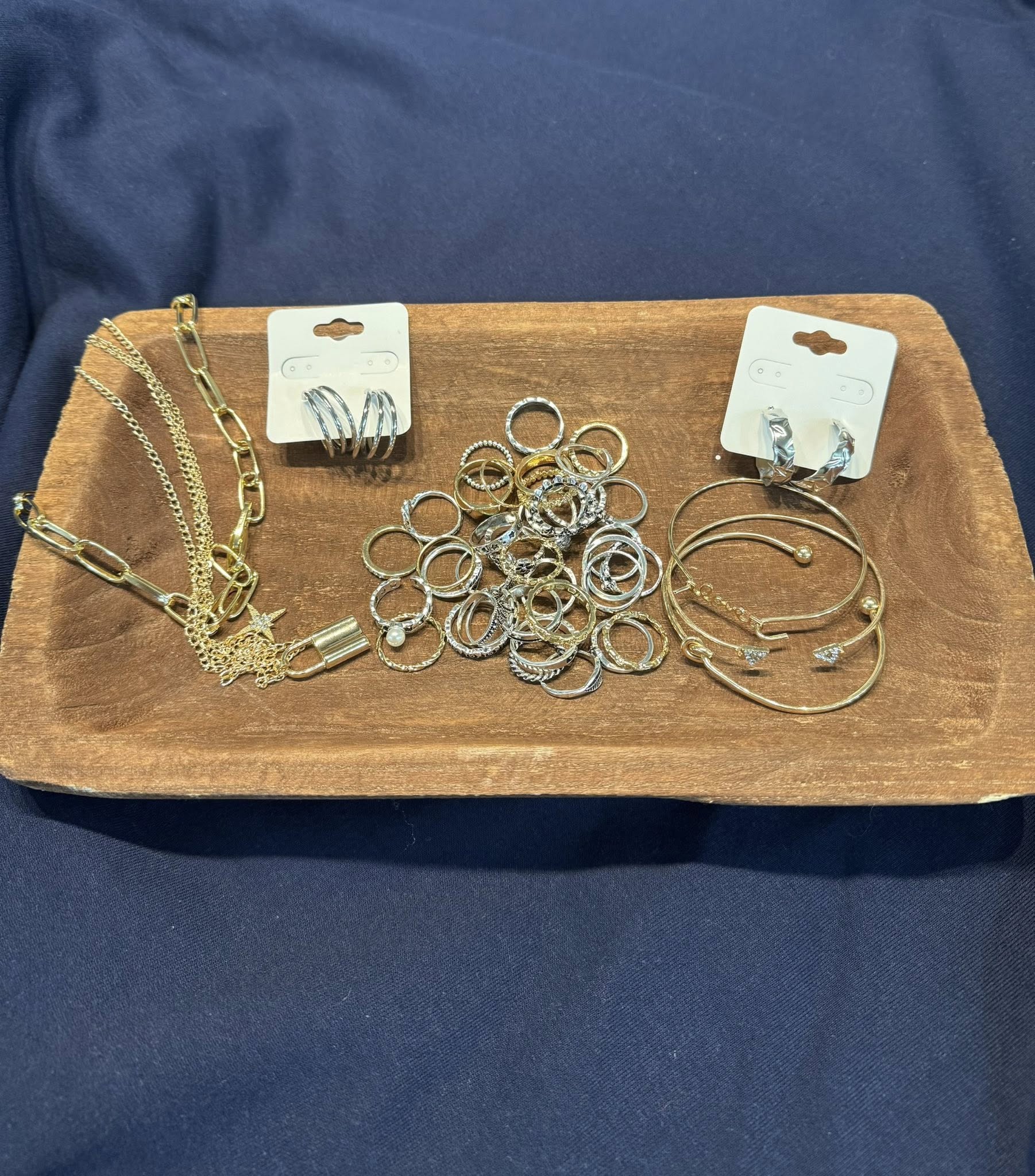 Get ready for a surprise with our Mystery Jewelry Grab Bags! Each bag contains 3 randomly selected pieces of silver or gold cosmetic jewelry, including necklaces, bracelets, earrings, and rings. Get a mixture of styles and have fun discovering your new favorite pieces!