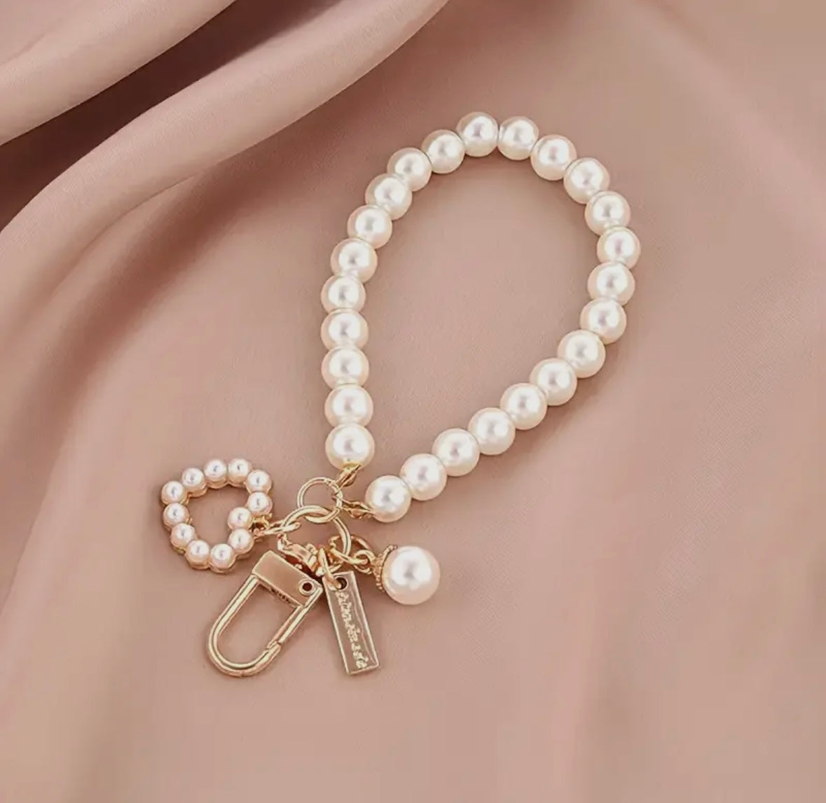 Experience charm and convenience with our Pearl Wristlet Keychain. With multiple charms, this keychain not only keeps your essentials close at hand, but also adds a touch of elegance to your everyday routine. Stay organized and stylish with this must-have accessory.