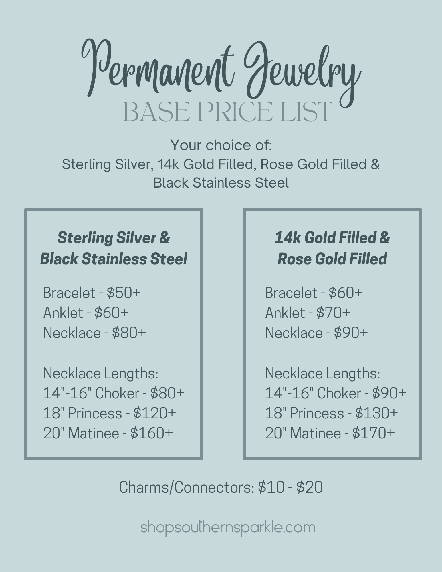 NOTE: There is a $10 booking fee due at the time of setting up your appointment. Your remaining balance will vary depending on what style chain you choose, if you choose a bracelet, necklace or anklet and if you choose any charms. Your remaining balance will be due after your completed appointment.