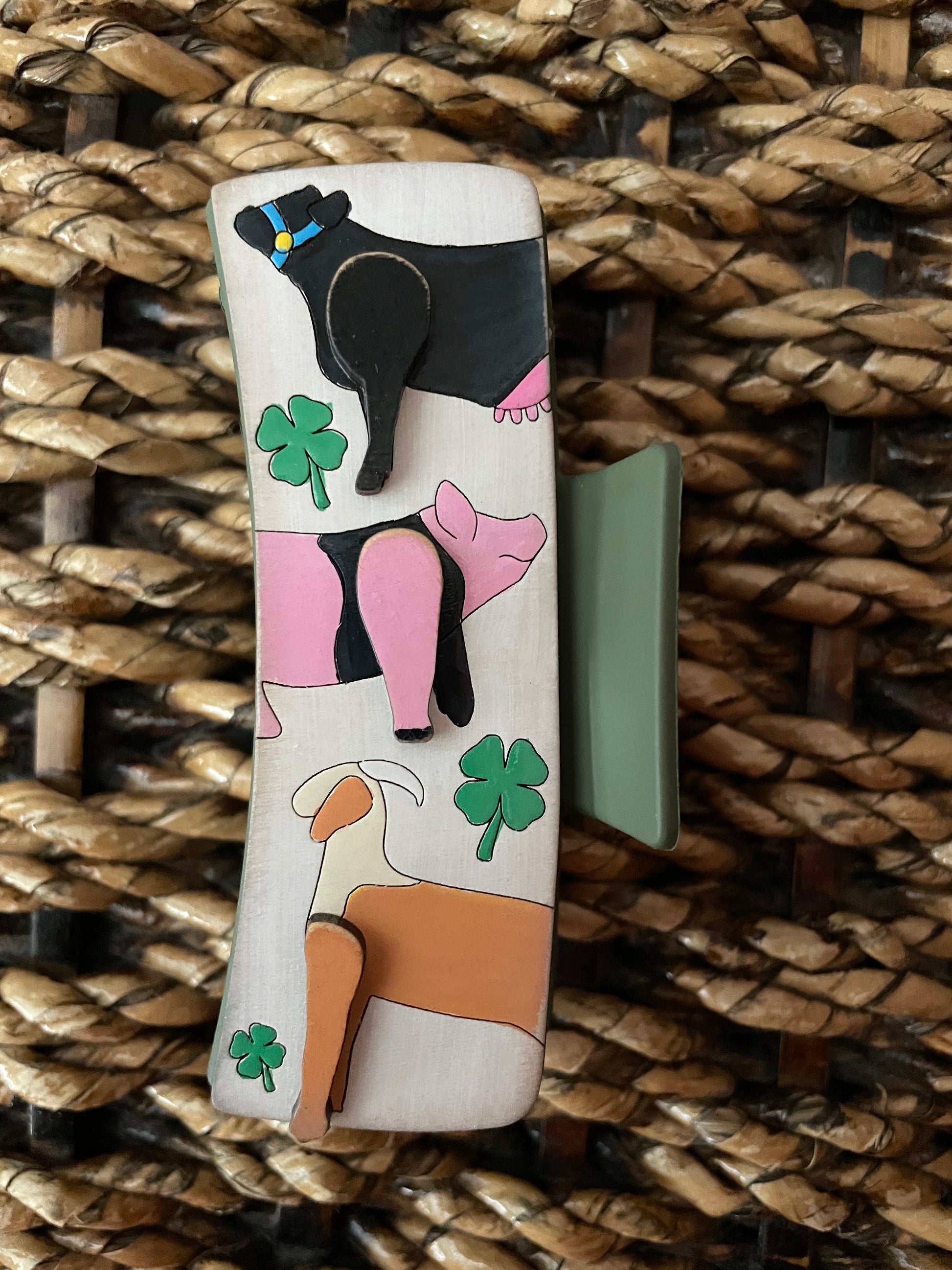 Get a grip with this Show Animals 4" claw clip! Hand painted on wood, these adorable critters will add a playful touch to any hairstyle. Meticulously crafted for all kinds of hair, this clip is as practical as it is charming. (No animals were harmed in the making of this clip!)