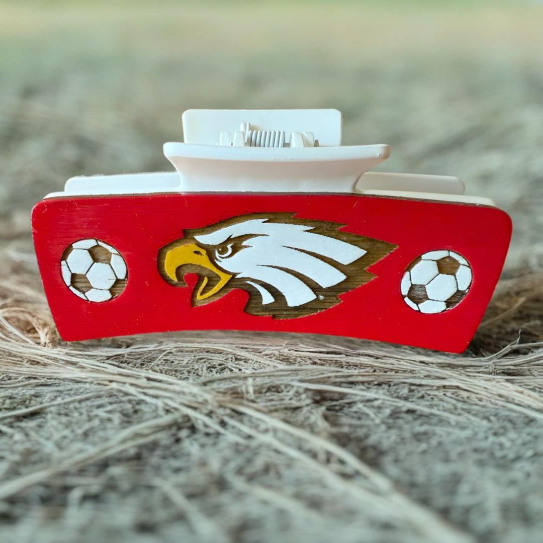 Show your team spirit with this hand-painted, laser-engraved 4" claw clip featuring a fun soccer design. Perfect for supporting your local player while keeping your hair stylishly in place during game day or practice. Add a playful touch to your look and cheer on your favorite team with every wear!