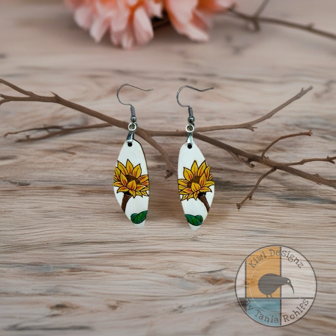 These Sunflower single flower drop earrings feature hand-painted wooden petals that bring a vibrant, natural charm to your look. Lightweight and laser-cut for precise detail, they offer comfortable wear all day long. The hypoallergenic earring hooks ensure a gentle fit, perfect for sensitive ears. Add a touch of sunshine to your style with these beautifully crafted earrings.
