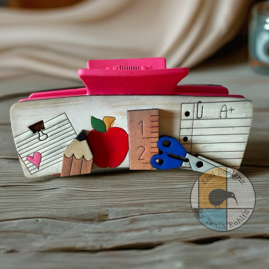 Our Teacher Claw Clip is a hand-painted, 4" wooden clip that is the perfect way to thank a teacher! Its sturdy design securely holds hair in place and its stylish appearance adds a fun and unique touch to any outfit. Show your appreciation with this practical and thoughtful gift.