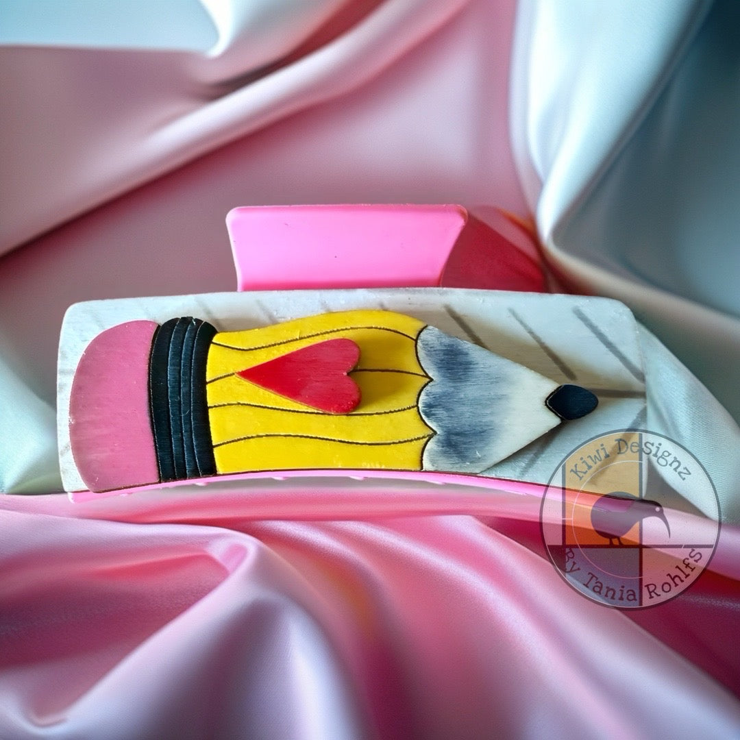 Add a touch of charm to your teacher’s day with this 4" wooden pencil claw clip. Hand-painted and handcrafted with care, it’s the perfect sweet little gift to keep her hair stylish and her smile bright. Practical, playful, and full of heart!
