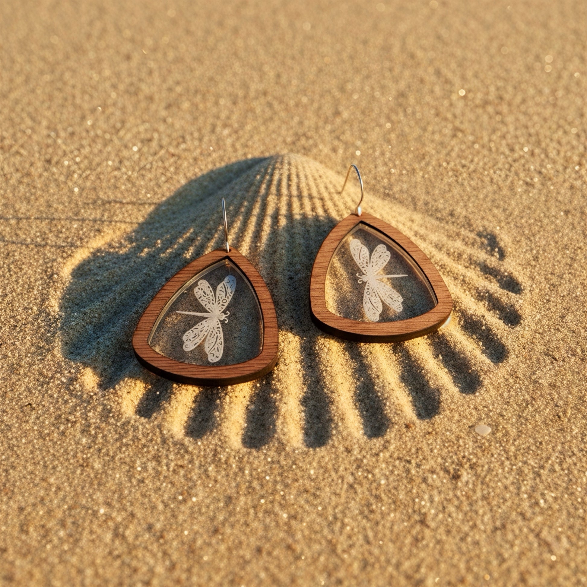 These striking triangle dragonfly earrings blend nature-inspired artistry with modern edge. Laser-etched details on wood and acrylic create intricate dragonfly designs that catch the light beautifully. Hypoallergenic wires ensure comfortable all-day wear without irritation. Perfect for those bold enough to make a statement with their accessories—delicate yet daring, these earrings celebrate the beauty of transformation and freedom.