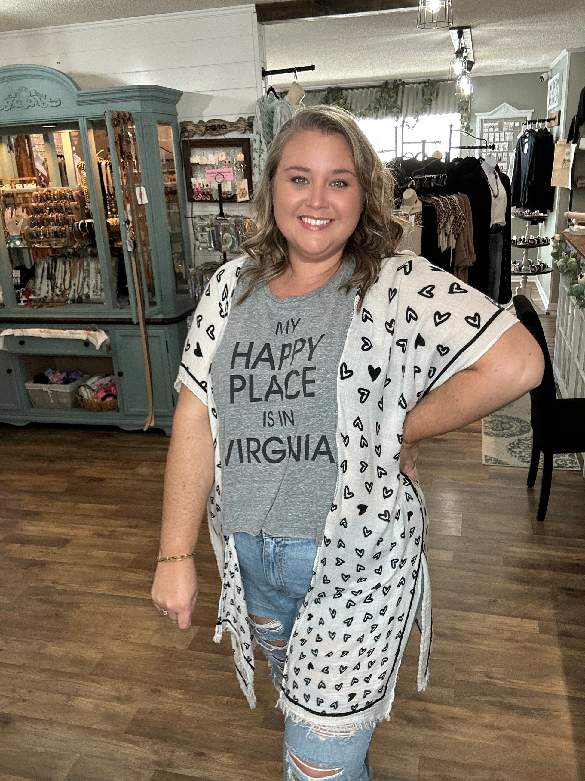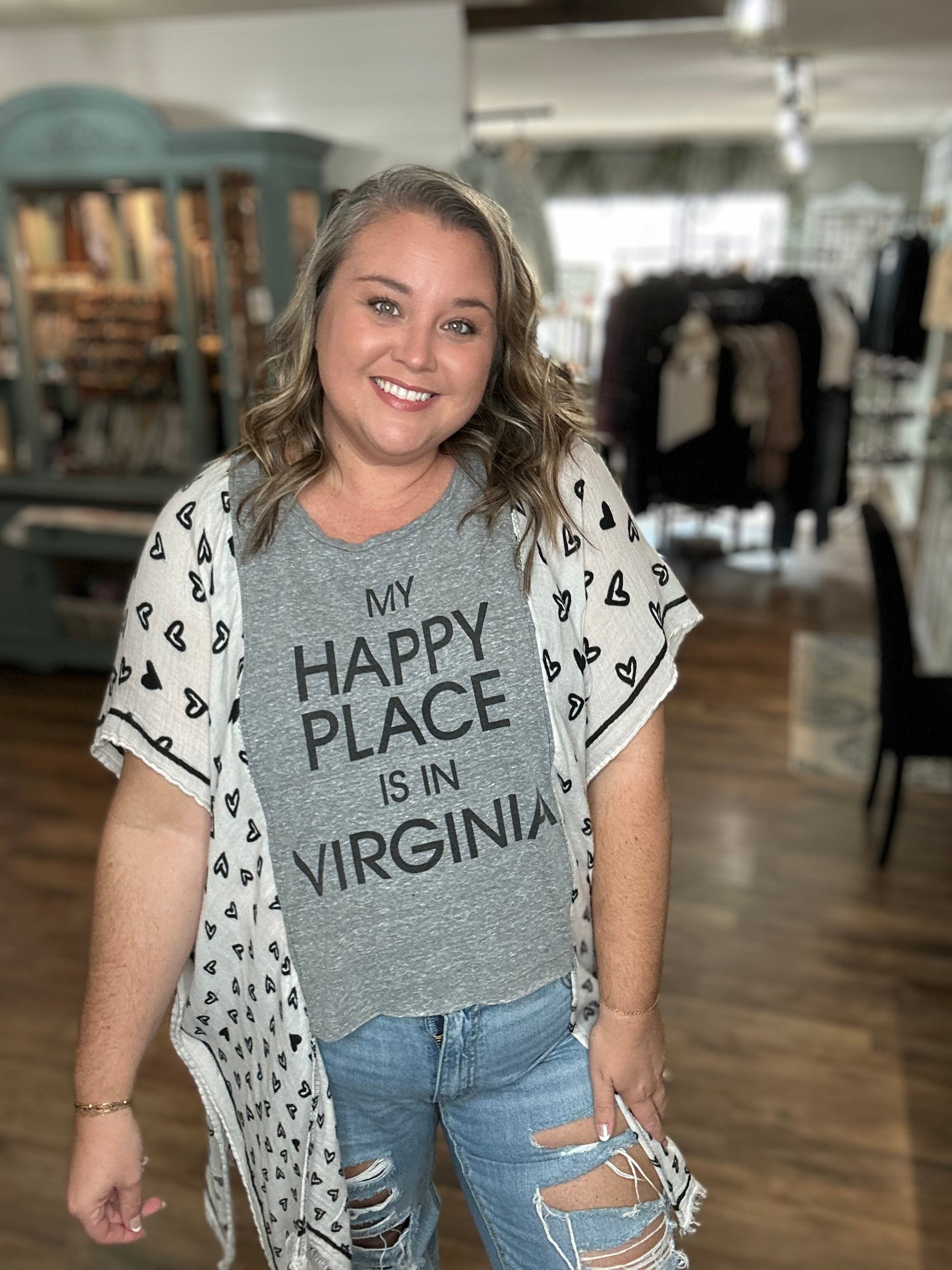 This Virginia is my Happy Place Poncho Tee is hand stitched and repurposed for a unique and eco-friendly piece. Made from a soft tee, it's perfect for showing off your love for Virginia while also making a sustainable fashion choice. A must-have for any wardrobe.