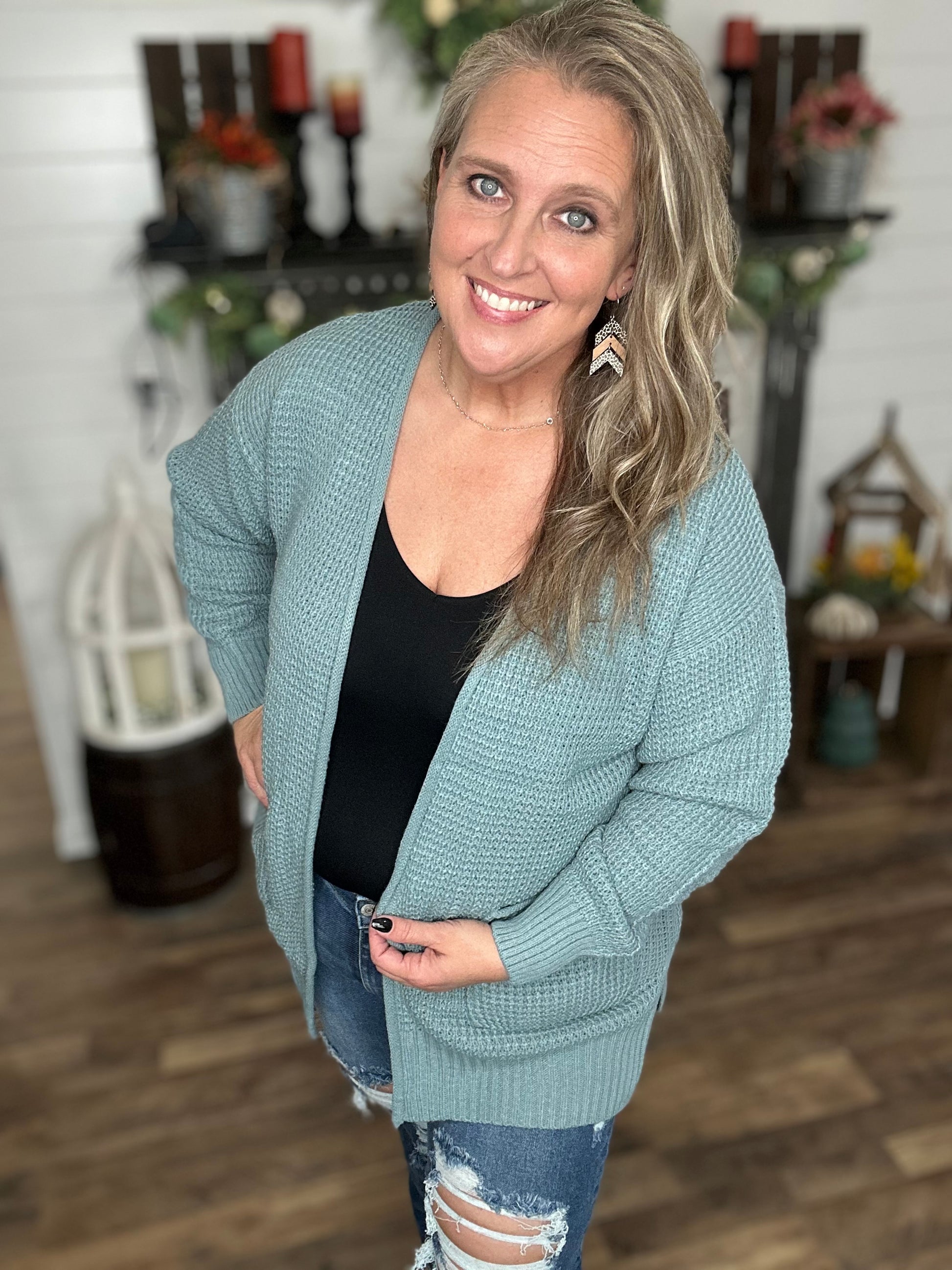 Stay warm and stylish with the Want It Waffle Knit Cardigan Sweater. This mid-weight sweater features two pockets for added convenience. Perfect for any occasion, keep cozy while looking chic.