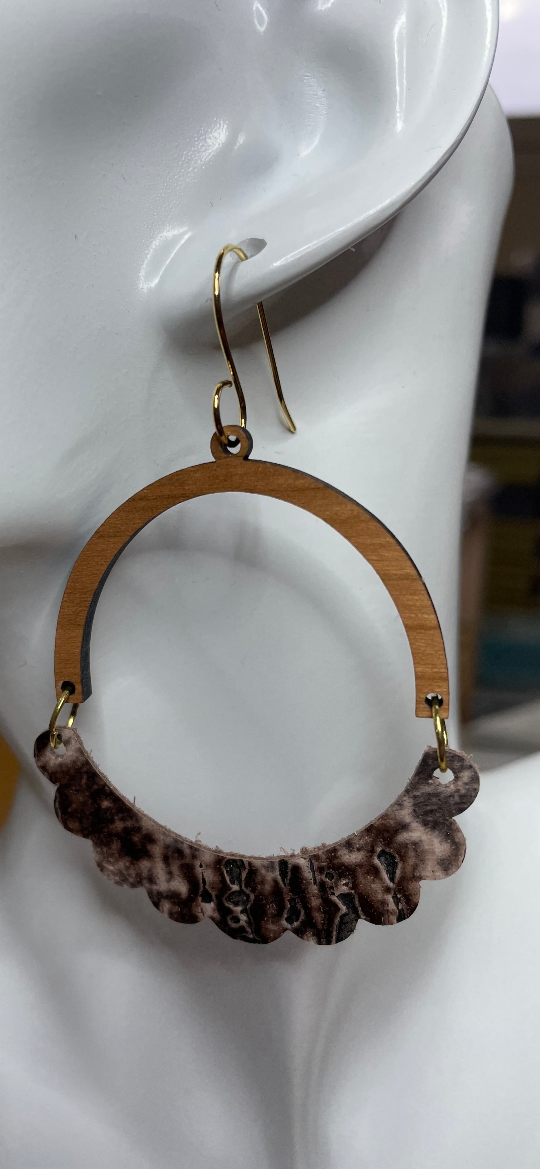 Wood half hoop and leather fluted earrings