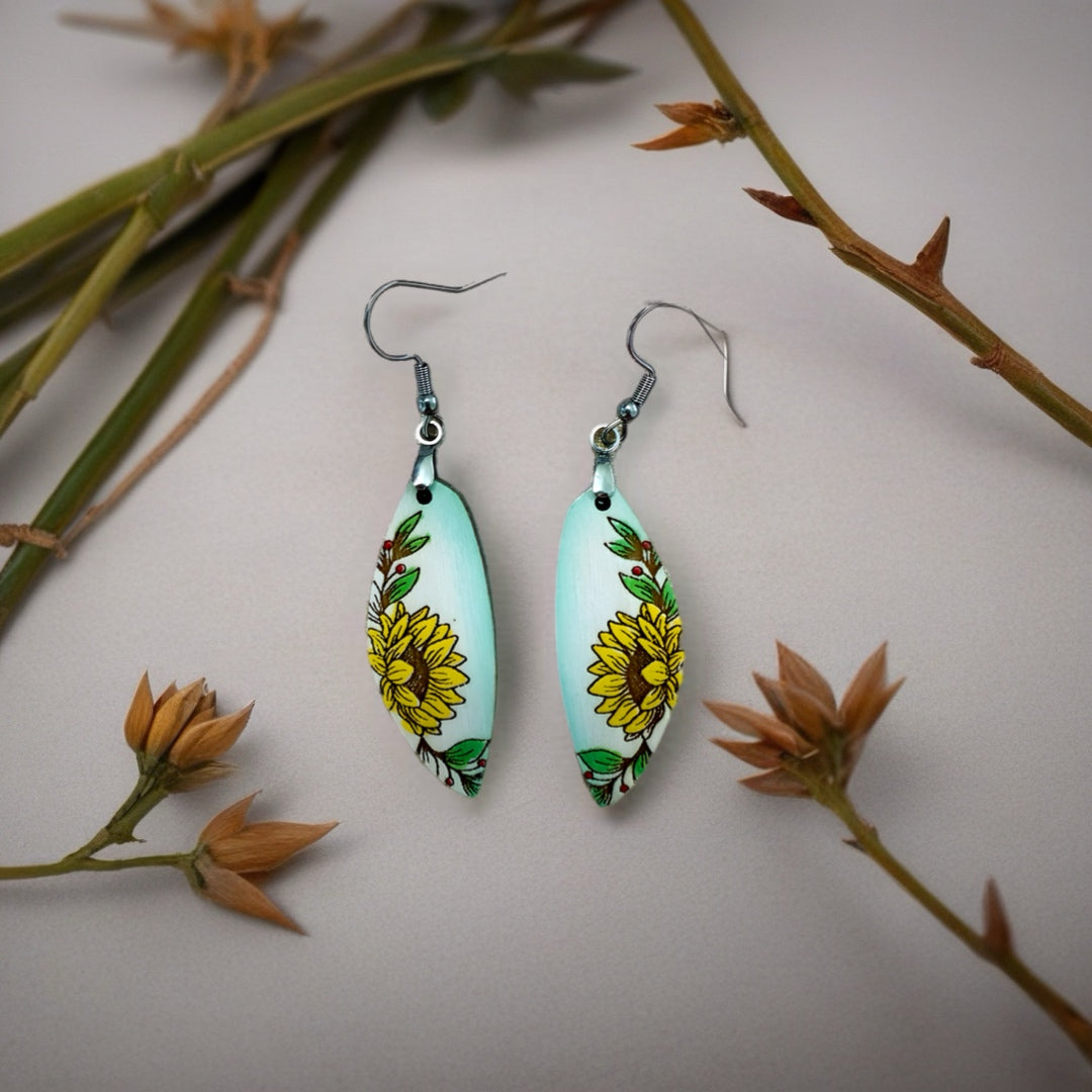 These wooden drop sunflower earrings combine delicate laser-cut craftsmanship with hand-painted details for a unique, eye-catching accessory. Lightweight and comfortable, they feature hypoallergenic earring hooks, making them ideal for sensitive ears. Add a touch of natural charm and vibrant style to any outfit with these beautifully crafted earrings.